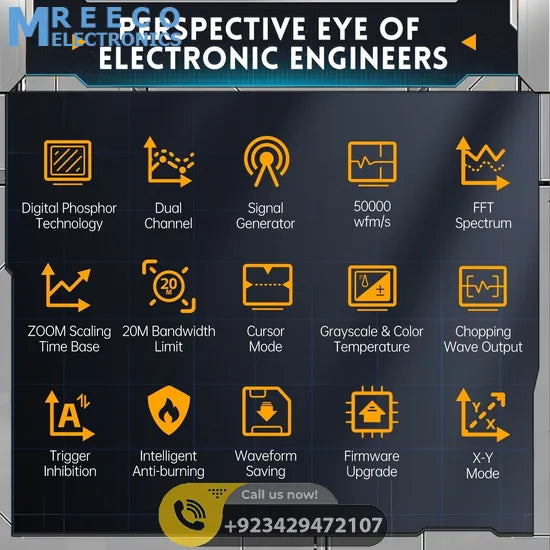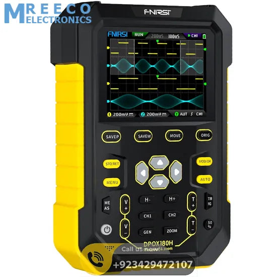 The DPOX180H is a cost-effective, handheld dual-channel digital phosphor oscilloscope from FNIRSI, combining an oscilloscope and signal generator. It features a 500MSPS real-time sampling rate, 180MHz bandwidth, and a 2.8-inch high-contrast IPS LCD. With a refresh rate of up to 50,000 waveforms per second, it captures even rare signal anomalies. The ZOOM time base aids digital protocol analysis, and with 5mV sensitivity, it can measure small signals accurately. Key features include noise filtering, a high-precision digital trigger with three modes, and a DDS signal generator supporting up to 20MHz. Additional functions include one-button auto adjustment, waveform storage for up to 250 sets, high-voltage protection up to 400V, USB export, and fast charging (5V/2A).