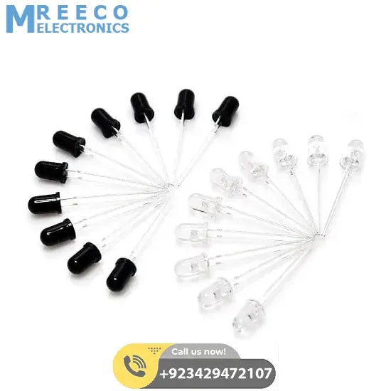 IR Infrared LED Transmitter And Receiver Pair is the combo of both IR LED & photodiode. IR Transmitter And Receiver, which together can work as an IR sensor module. This is the IR Transmitter and Receiver pair-matched pair used in our IR proximity, White Line or Micromouse sensor. It consists of 940 nanometer wavelength high power IR LED and photodiode having a peak sensitivity at 940-nanometer wavelength.