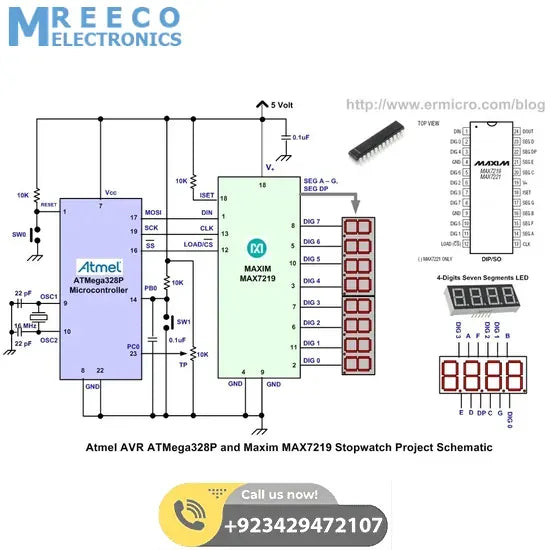 The MAX7219 is a compact, serial input/output common-cathode display driver that allows you to easily control 7-segment numeric LED displays of up to 8 digits, bar-graph displays, or 64 individual LEDs. Included on-chip are a BCD code-B decoder, multiplex scan circuitry, segment and digit drivers, and an 8×8 static RAM that stores each digit. Only one external resistor is required to set the segment current for all LEDs.