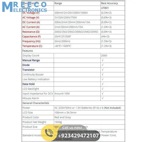 Specifications Of Bench Digital Meter UNI-T UT 801: