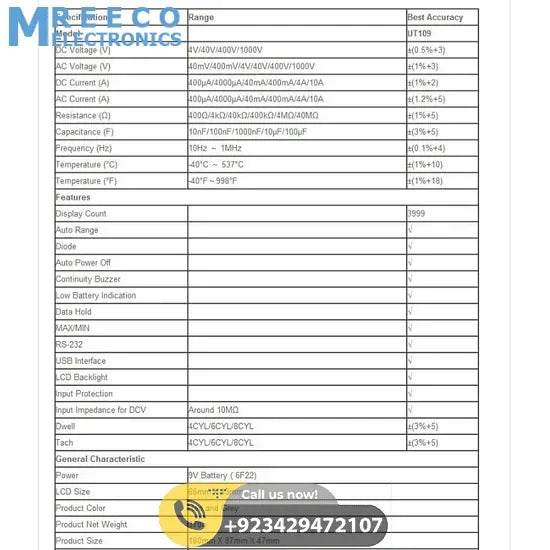 Specifications Of Best Multimeter For Electronics UNI-T UT 109: