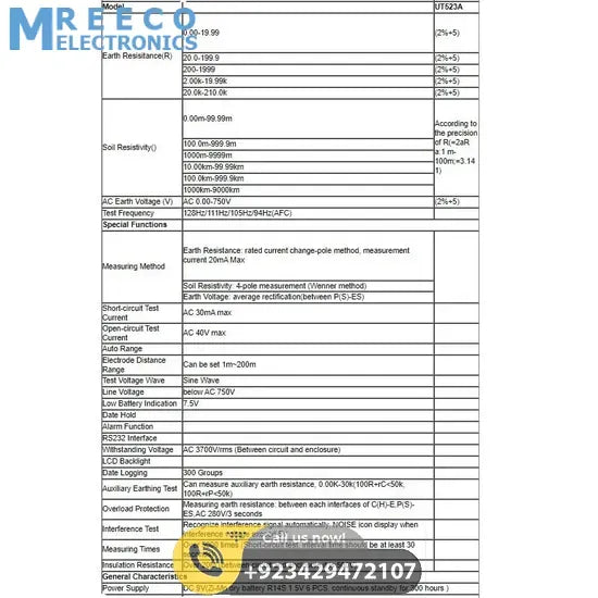 Specifications Of Uni-Trend Earth Ground Resistance Meter UT-523A:
