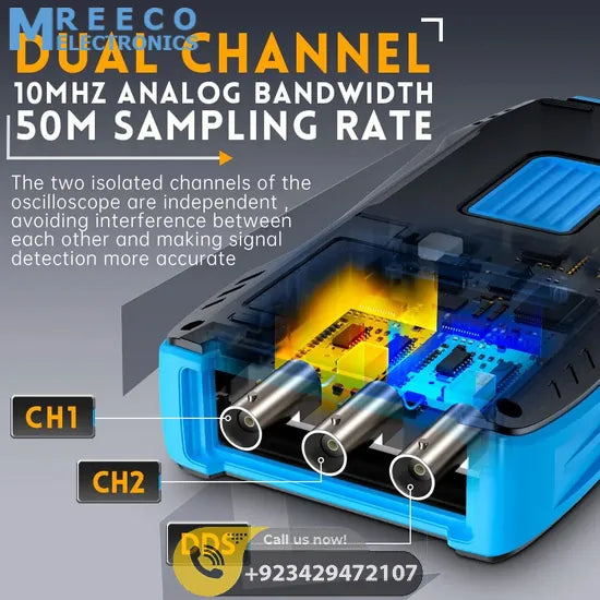 The FNIRSI-2C23T is a versatile 3-in-1 dual-channel digital oscilloscope designed for maintenance and development work. It combines an oscilloscope, multimeter, and signal generator in one device. The oscilloscope features FPGA+MCU+ADC architecture, 50 MS/s sampling rate, 10 MHz bandwidth, and high-voltage protection, supporting peak voltage measurements up to ±400V. It allows saving and analyzing waveform screenshots.