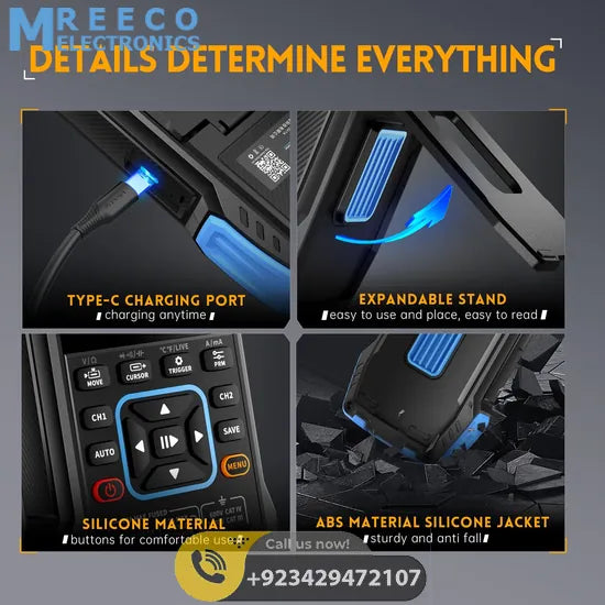The multimeter offers 4-digit, 10,000-point true RMS measurements for AC/DC voltage, current, resistance, capacitance, diode, and continuity. The built-in DDS signal generator outputs 7 signal types, with adjustable frequency (up to 2 MHz), amplitude, and duty cycle.
